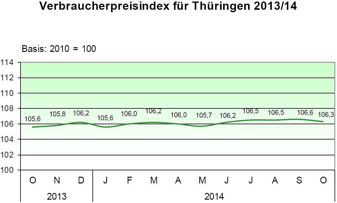 Die Jahresteuerungsrate sank nach Mitteilung des Thüringer Landesamtes für Statistik auf 0,7 Prozent, im Vormonat betrug sie 0,8 Prozent. Gegenüber dem Vormonat September 2014 sank der Verbraucherpreisindex im Durchschnitt um 0,3 Prozent und erreichte einen Indexstand von 106,3 Prozent (Basis 2010=100).