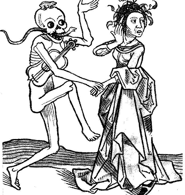 Wer tanzt hier eigentlich mit wem? Tanz die Sterbliche mit dem Tod oder der Tod mit der Sterblichen? Eine Schlange hat der Tod noch zusätzlich im Mund.
