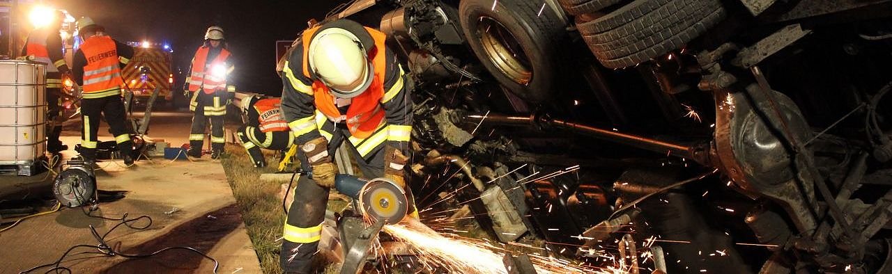 Für die Bergung entfernte die Feuerwehr Teile der Leitplanke mittels Schraubenschlüssel und Trennschleifgerät. Hierbei sicherte ein Trupp den Brandschutz. Um ungefährdet unter dem gekippten Unfallfahrzeug arbeiten zu können, musste dieses mit Holz und einem Stabilisierungssystem gesichert werden. So konnte der Diesel aus den undichten Tanks gepumpt und der Lkw anschließend durch ein Spezialunternehmen geborgen werden. Zweieinhalb Stunden nach Alarmierung verließ das letzte der vier eingesetzten Feuerwehrfahrzeuge die Unfallstelle.
