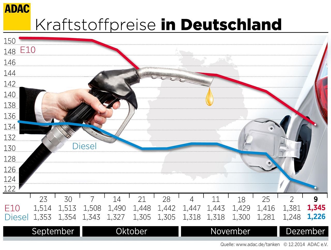 Die Kraftstoffpreise sinken weiter und erreichen einen neuen Tiefststand für das Jahr 2014. Damit ist Sprit so günstig wie zuletzt vor vier Jahren. Autofahrer zahlen an den Zapfsäulen deutscher Tankstellen im bundesweiten Schnitt für einen Liter Super E10 1,345 Euro...