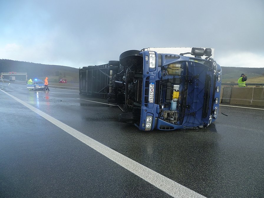 Dadurch geriet das Gespann ins Schlingern. Der Lkw fuhr gegen die linke Betongleitwand, kippte danach auf die linke Fahrzeugseite um und kam auf der linken und rechten Fahrspur zum Liegen.