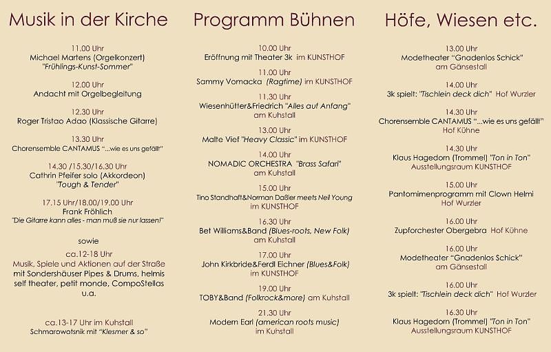 Mit dabei sind u.a. Bet Williams & Band, Modern Earl, Modetheater Gnadenlos Schick, Cathrin Pfeifer, Frank Fröhlich, John Kirkbride & Ferdl Eichner, Sondershäuser Pipes & Drums, Malte Vief, Theaterwerkstatt 3k Mühlhausen, Friedrich & Wiesenhütter, TOBY & Band, Nomadic Orchestra, Tino Standhaft & Norman Daßler, Roger Tristao Adao, Chorensemble CANTAMUS, Zupforchester Gebra, Helmis Self Theater, Schmarowotsnik, Samy Vomacka, Die Compo Stellas.