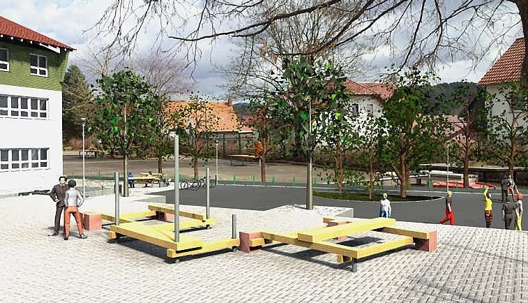 So werden die mit der Anordnung eines Kleinspielfeldes mit Kunststoffbelag sowie großzügiger Sitzbereiche im Jahr 2014 begonnenen Arbeiten am Pausenhof der Grund- und Regelschule in Berlingerode in einem 2. Bauabschnitt ihre Fortsetzung finden. Angedacht sind der Ersatz des Nebengebäudes und die Erneuerung des Nutzbelages der zentralen und großzügig zugeschnittenen Pausenhoffläche, die auch künftig für Bewegungsspiele, Verkehrserziehung und schulische Veranstaltungen zur Verfügung stehen soll. Ergänzt werden diese und die im 1. Bauabschnitt gestalteten Bereiche durch großzügige und jugendgerechte Sitzlandschaften in einer Materialkombination aus Holz, Stahl und Beton.