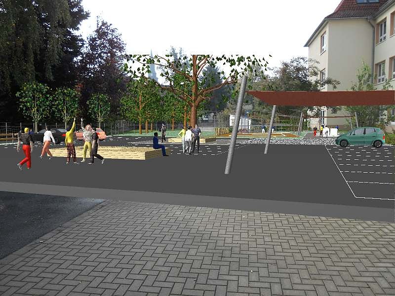 Zusätzliche Sonnensegel über ausgewählten Aufenthaltsbereichen des Pausen- und Hortbetriebes sollen das Fehlen eines wirkungsvollen Starkbaumbestandes kompensieren und eine Nutzung in sonnenreichen Nachmittagsstunden ermöglichen. In Fortführung dieser Arbeiten ist die Anordnung dringend benötigter Stellplätze im Umfeld der Schulsporthalle geplant.