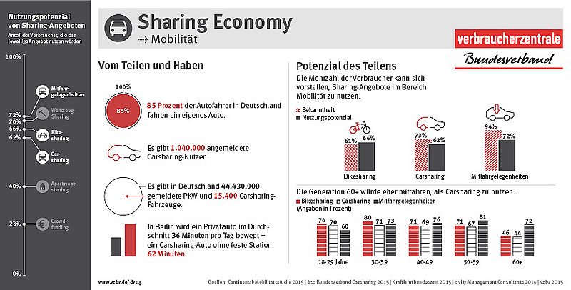 Laut Umfrage des vzbv hat die Sharing Economy in Deutschland im Bereich Mobilität Potenzial: Je zwei Drittel oder mehr der Befragten können sich vorstellen, Mitfahrgelegenheiten (72 Prozent), Bikesharing (66 Prozent) oder Carsharing (62 Prozent) zu nutzen. Weniger Interesse besteht am Apartmentsharing (40 Prozent) und Crowdfunding (23 Prozent). Insgesamt sprechen Sharing-Angebote eher die jüngere Generation an.