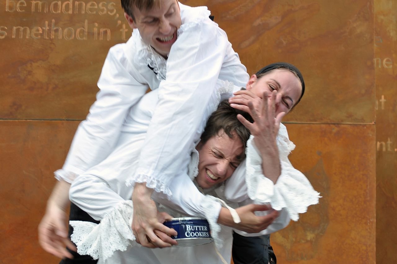 Gleich dreimal stehen hier die Mimen Anika Kleinke, Oliver Seidel und Thomas Wiesenberg in unzähligen Rollen auf der Bühne im Innenhof und geben Shakespeares sämtliche Werke (leicht gekürzt) zum besten.