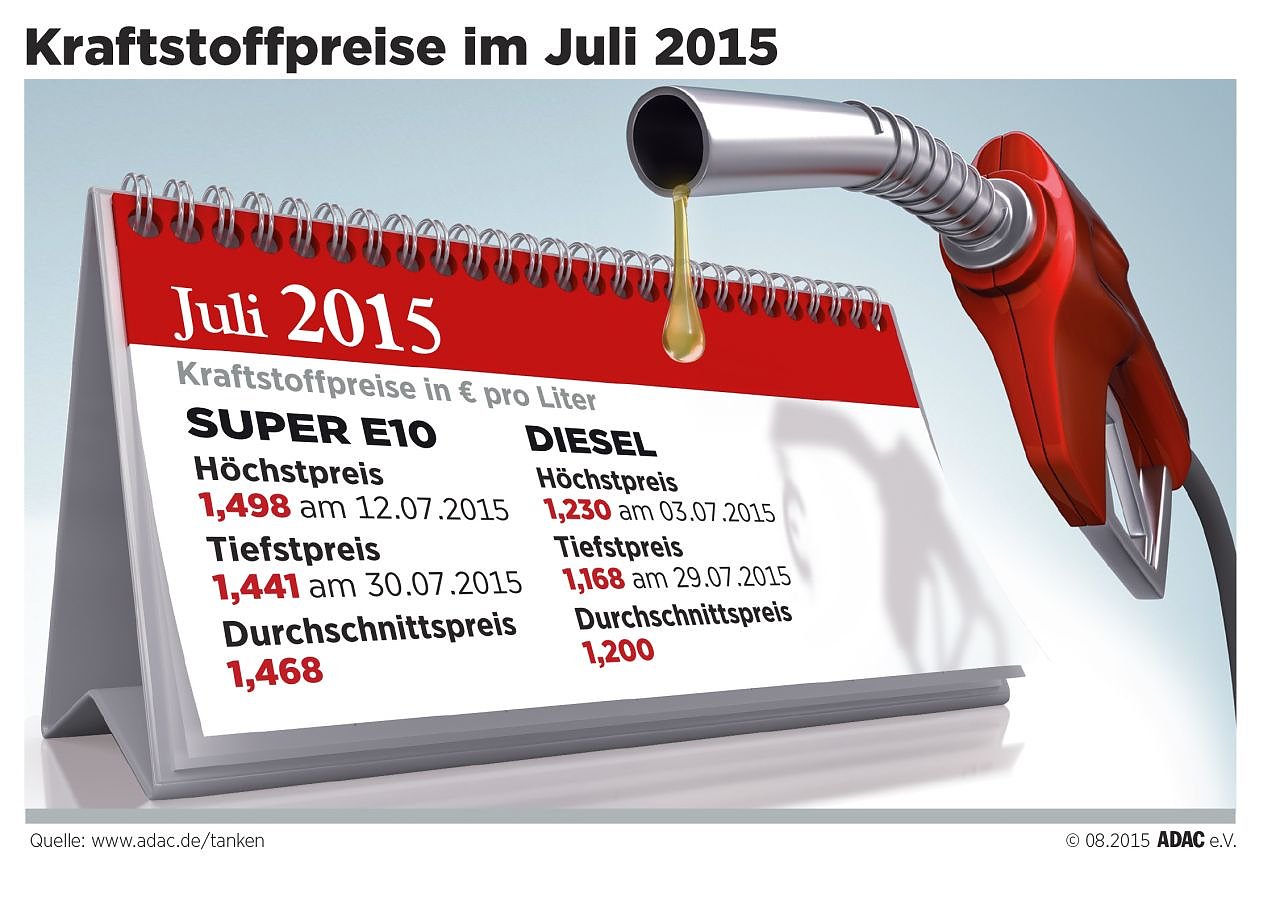 Teuerster Tag zum Tanken im vergangenen Monat war für Benzin der 12. Juli. Ein Liter Super E10 kostete damals 1,498 Euro und erreichte damit auch einen neuen Jahreshöchststand. Mit einem Preis von 1,441 Euro markierte E10 am 30. Juli den günstigsten Monatswert. Teuerster Dieseltag war der 3. Juli bei einem Tagesdurchschnitt von 1,230 Euro. Am preiswertesten war der Selbstzünderkraftstoff am 29. Juli mit 1,168 Euro.