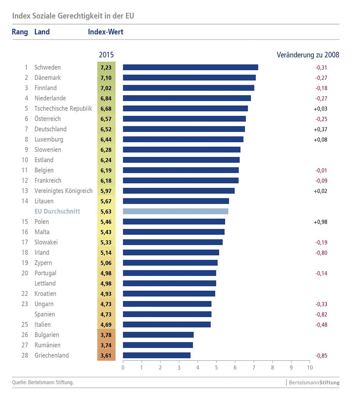 Zusatzinformationen: Mit dem EU-Gerechtigkeitsindex untersucht die Bertelsmann Stiftung jährlich anhand von 35 Kriterien die Teilhabechancen in den 28 EU-Mitgliedstaaten. Hierbei werden sechs verschiedene Dimensionen sozialer Gerechtigkeit betrachtet: Armut, Bildung, Arbeitsmarkt, Gesundheit, Generationengerechtigkeit sowie gesellschaftlicher Zusammenhalt und Nicht-Diskriminierung. Die Datenerhebung wurde am 25.8.2015 abgeschlossen.