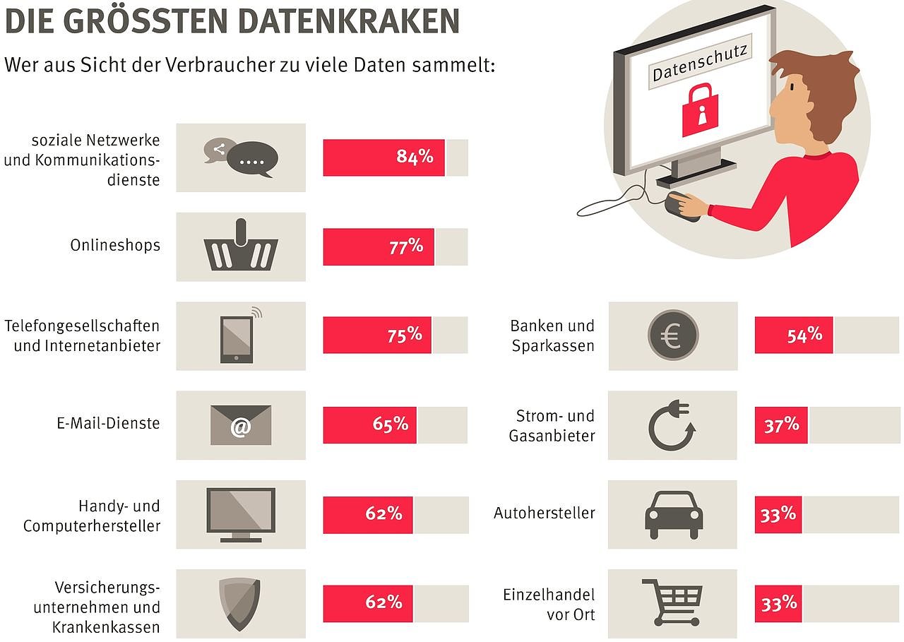 Im digitalen Zeitalter werden zahlreiche persönliche Daten erfasst – aus Verbrauchersicht oftmals zu viele. Die größten Datenkraken laut Umfrage sind soziale Netzwerke und Kommunikationsdienste wie Facebook und WhatsApp: 84 Prozent der Befragten meinen, dass diese zu viele Daten sammelten. Kritisch sehen Verbraucher auch die Datenerfassung bei Einkäufen im Internet (77 Prozent), bei Telefongesellschaften und Internetanbietern (75 Prozent) sowie bei E-Mail-Diensten (65 Prozent).