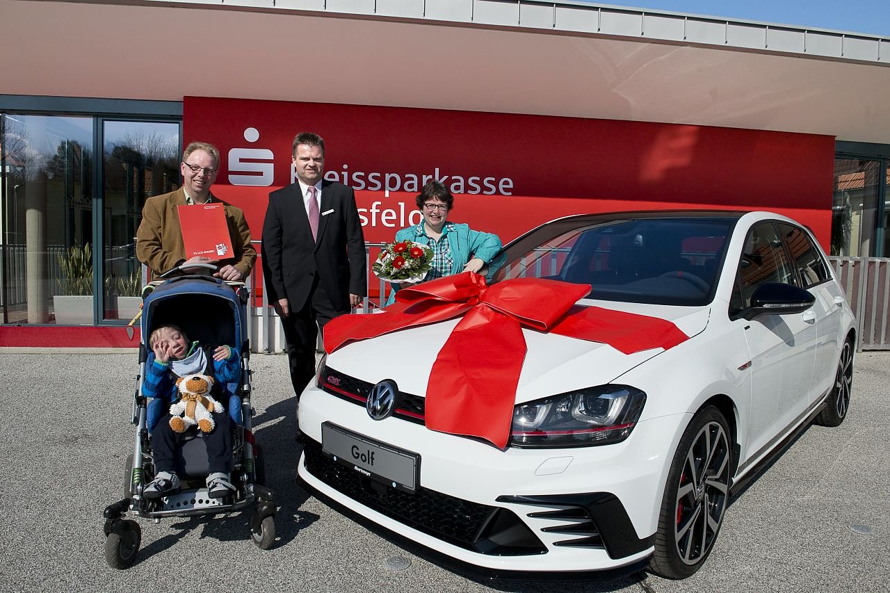 Die Eheleute Stefan und Elisabeth Bust freuen sich mit Sohn Jonas über den bei der Sonderauslosung des PS-Los-Sparens Golf GTI, zu dem sie Frank Sondermann, Mitglied des Vorstandes der Kreissparkasse Eichsfeld, herzlich beglückwünschte.