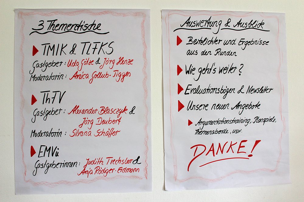 Diskutiert wurde in der Form eines World Café. An drei Tischen wurde gleichzeitig diskutiert und pro Tisch gab es Schwerpunktthemen und alle Teilnehmer rotierten nach 35 Minuten von einem Tisch zum Anderen. Die Moderatoren des Tisches informierten kurz, was in der Runde zuvor schon diskutiert wurde. Das Format gefällt mi so Innenstaatssekretär Udo Götze, hatte aber auch seinen Haken, dass manches durch die Akustik schwer zu verstehen war.