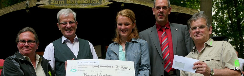 Höhepunkt des Abends war auch eine Geldspende von 500 Euro von Büschlebs Mühle, die Inhaberin Teresa Büschleb und ihr Vater Wilhelm Büschleb dem Bärenpark für Tierfutter überreichten. Der Worbiser Bürgermeister Thomas Rehbein gab noch 100 Euro dazu. Da war die Freude natürlich groß. Doch es gab am Abend noch mehr Engagement für die Bären und Wölfe - eine gelungene Auktion, die ein Gesamterlös von 895 Euro erzielte. Heike Lindemann hatte mit viel Humor die Auktion durchgeführt und es hatten viele Gutscheine und Gemälde den Besitzer gewechselt. Man konnte beispielsweise einen Gutschein mit Löffel ersteigern, damit man einem Bär Honig geben kann, oder man konnte einen Tag als Tierpfleger ersteigern u.a.
