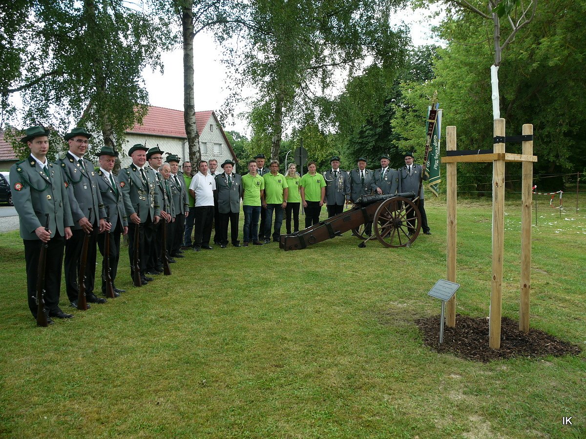 Und es gab noch etwas Besonderes zur Eröffnung: Der Schützenverein hat einen Ahornbaum pflanzen lassen und ihn Schützen-Ahorn getauft. Es gibt 100jährige Menschen, aber 1000jährige Bäume und er wünsche sich, dass einmal Enkel und Urenkel schöne Stunden unter diesem Baum verbringen, betonte der Vorsitzende des Schützenvereins. Er dankte der Firma Gewässer und Tiefbau Krumbholz aus Ringleben, die den Baum setzte. Der Schützen-Ahorn wurde mit einem kräftigen Kanonenschuss begrüßt.