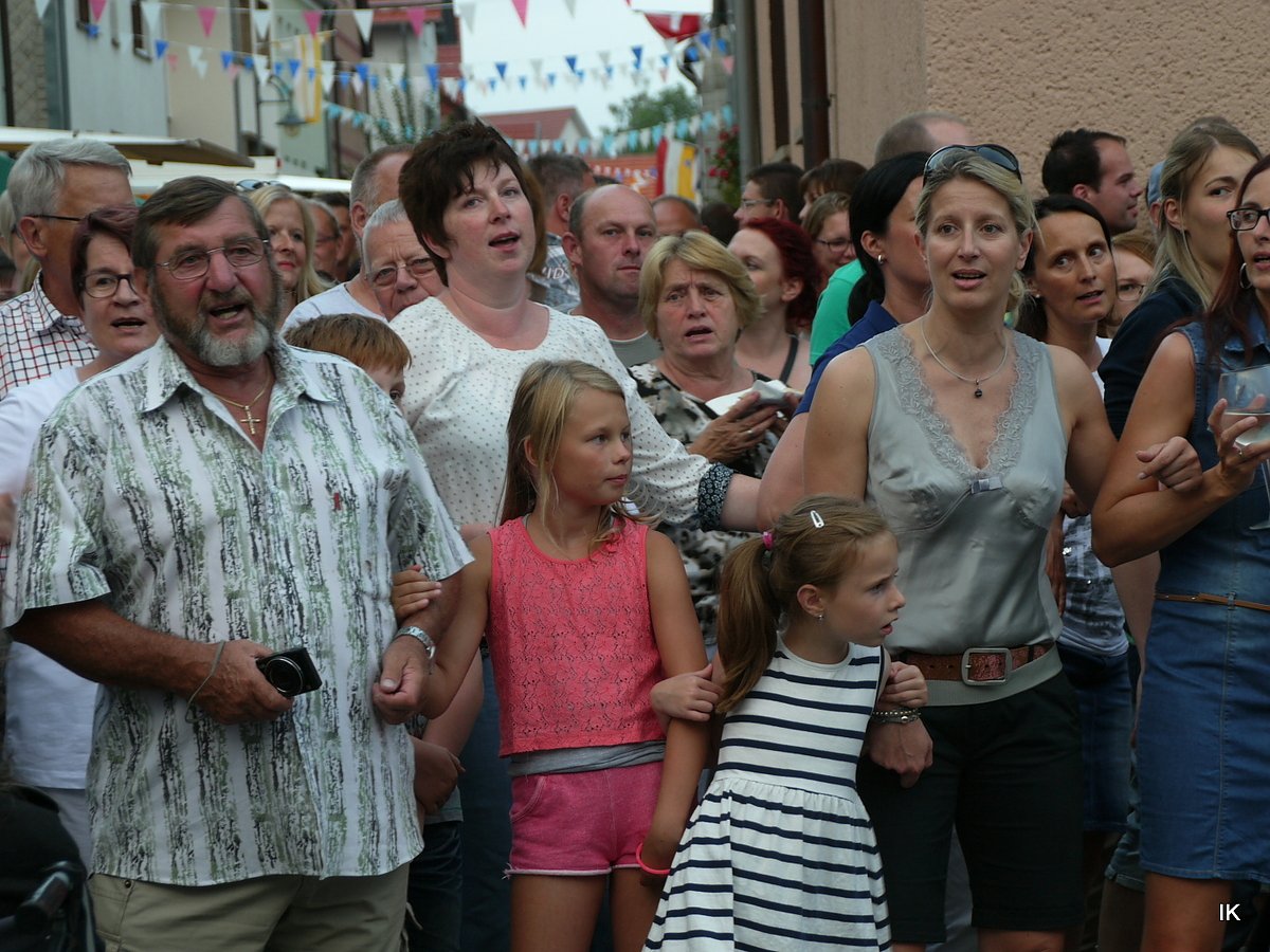 Mit der Kirmesfahne voran zogen die Kirmesburschen und die Ringaufreunde durch die Straße zur Bühne, begleitet von der Musik der Birkunger Blechbuben, die dann von den Estanas abgelöst wurden. Für letztere Band war die Ringaukirmes musikalisch Premiere. Die Thanas, die sonst jahrelang dort gespielt hatten, waren wohl im Urlaub.