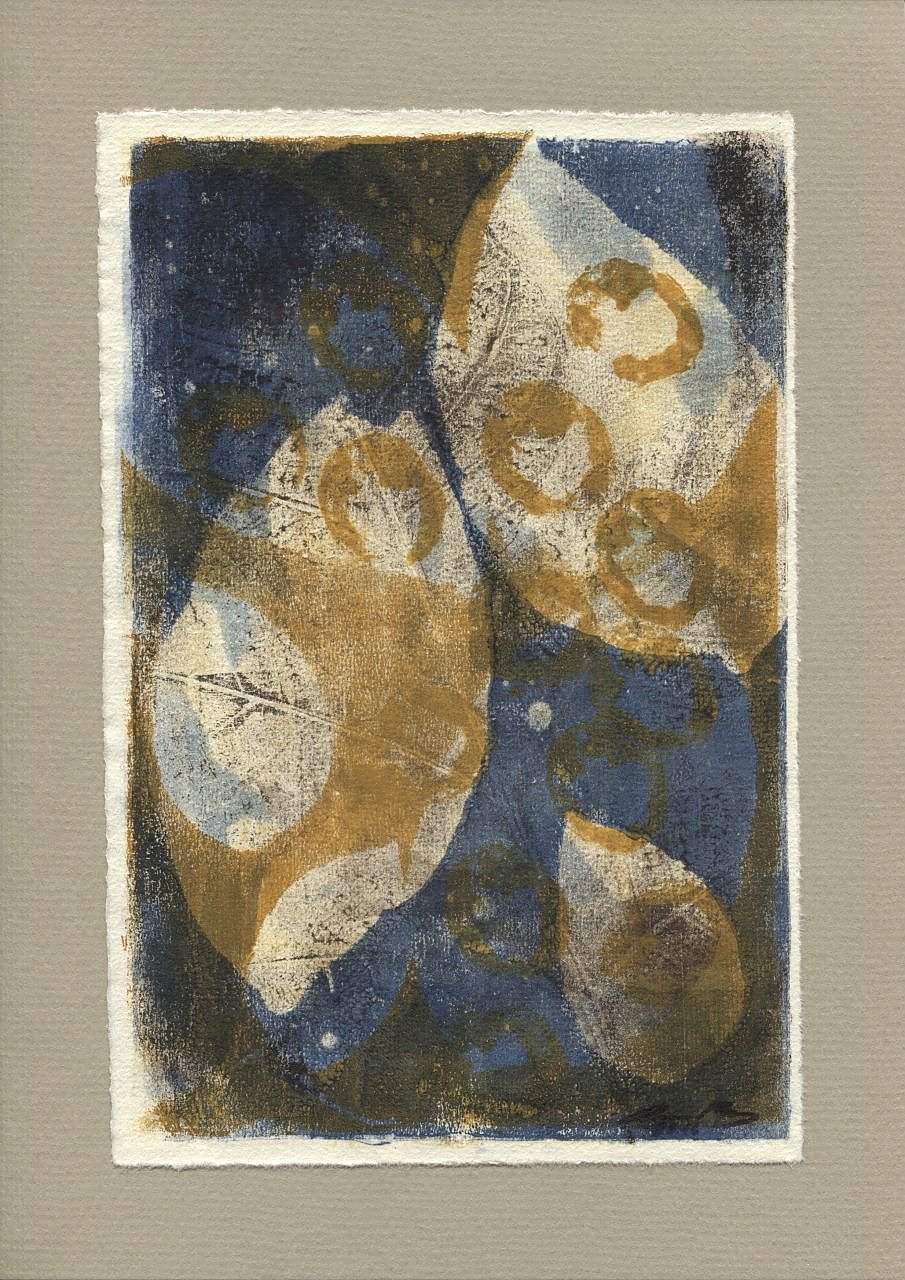 Für die Walnussvariationen stehen die Blätter des Walnussbaums Pate. Der Walnussbaum mit seinen vielfältigen symbolischen Bezügen gab die Inspiration zu den Monotypien. Jedes dieser Unikate auf Büttenpapier beschreibt andere Facetten, assoziiert andere Wahrnehmungen. Die Walnussbäume auf dem Hof Sickenberg werden am 25. September zum 8. Mal mit dem Walnusstag gefeiert.