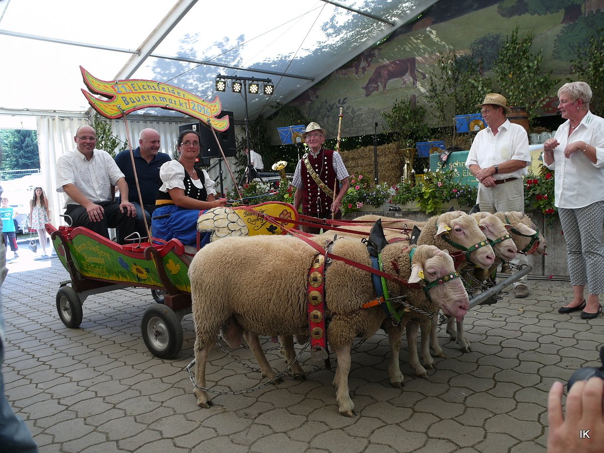 Dann fuhr traditionsgemäß die Schaf-Quadriga von Ernst Siebert in die Festhalle mit dem Kallmeröder Bürgermeister Torsten Städtler und dem Bürgermeister von Leinefelde-Worbis, Marko Grosa. Beide zapften das von der Brauerei Neunspringe spendierte Faß Bier an. Marko Grosa wünschte dem Bauernmarkt gutes Gelingen und verwies darauf, dass in Kallmerode es nur extremes Wetter zum Bauernmarkt gäbe, entweder Regen oder Hitze. Aber wenn es das einzige Problem wäre, dann könne man zufrieden sein.