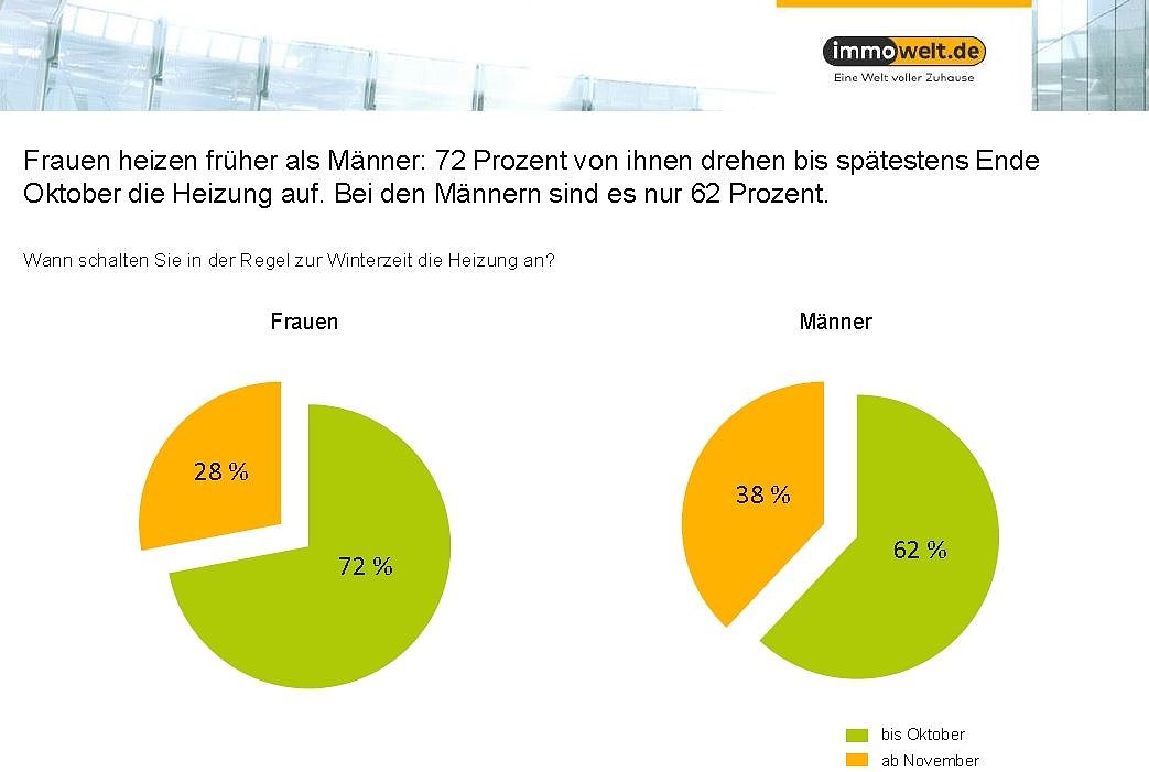 Frauen sind verfrorener: Bei 72 Prozent der weiblichen Befragten sorgt die Heizung spätestens Ende Oktober für eine warme Wohnung, von den Männern schalten nur 62 Prozent bis dahin die Heizung an. Auch in anderer Hinsicht unterscheiden sich Mann und Frau in ihren Heizgewohnheiten: Um Heizkosten zu sparen, zieht sich jede dritte Frau (33 Prozent) lieber einen warmen Pulli an oder hüllt sich in eine Decke – bei den Männern tun das nur 24 Prozent. Sie (34 Prozent) setzen zur Kosteneinsparung eher auf Technik und steuern ihre Heizung per Zeitschaltuhr (Frauen: 26 Prozent).