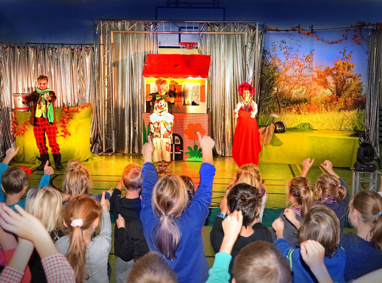 Eine Unterrichtsstunde lang vermittelte das Theaterteam den ca. 100 Grundschülern der 1. bis 4. Klassen kindgerechtes Wissen rund um das Thema Geld. Die Kinder lernten nicht nur durch Zuhören, sondern wurden von den Theaterleuten zum aktiven Lernen, Mitdenken und Mitbewegen animiert.