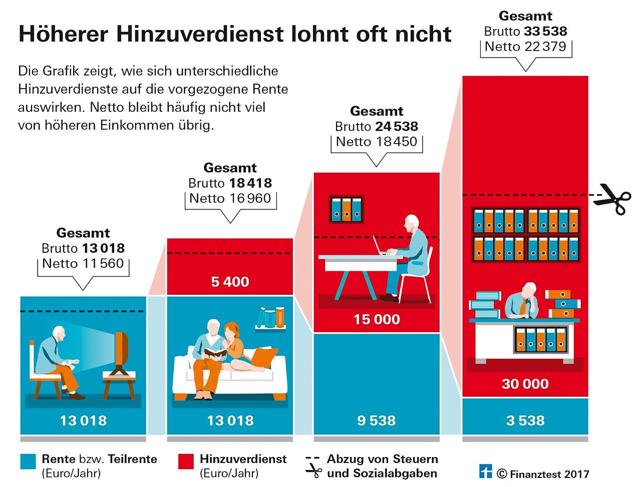 Freiwillige Beiträge in die gesetzliche Rentenversicherung zu zahlen ist ein Weg, den die neue Flexi-Rente eröffnet, um im Alter mehr Geld zur Verfügung zu haben. Zwei weitere Wege: Trotz erreichtem Rentenalter länger weiterarbeiten. Oder: Früher in Rente gehen und Hinzuverdienen. Wie der Hinzuverdienst auf die Rente angerechnet wird, war bislang recht kompliziert. Ab dem 1. Juli 2017 wird das deutlich einfacher. Bis zu einem jährlichen Verdienst von 6.300 Euro bleiben dem Frührentner sowohl die volle Rente als auch das volle Gehalt. Gehälter darüber hinaus werden zu 40 Prozent auf die Rente angerechnet. Deutlich höhere Steuern und Sozialabgaben machen höhere Hinzuverdienste jedoch oft unattraktiv.