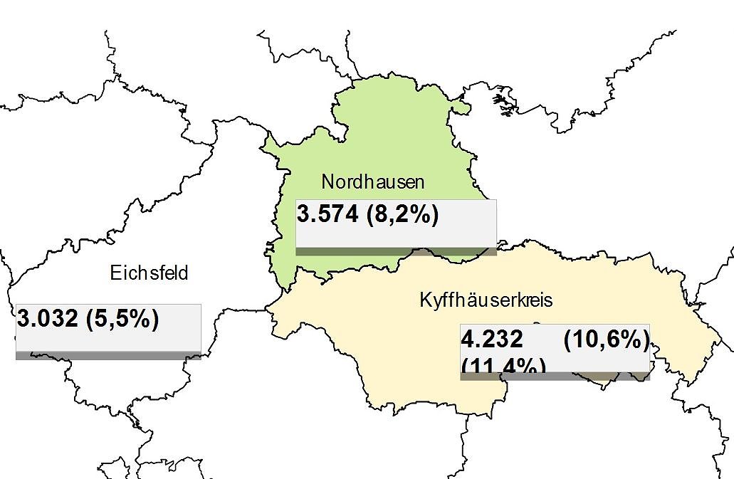 Gegenüber dem Vorjahr sank die Arbeitslosigkeit im Kyffhäuserkreis um 11,4 Prozent. Die Arbeitslosenquote liegt bei 10,6 Prozent. Vor zwei Jahren wurde ein vergleichbares Ergebnis nur im Sommer erzielt. Die Region bewegt sich damit auf dem Niveau des Ruhrgebietes. Im Vergleich zum Vormonat stieg die Zahl der Arbeitslosen im Landkreis um 12,8 Prozent an.Jugendarbeitslosigkeit auf niedrigem Niveau