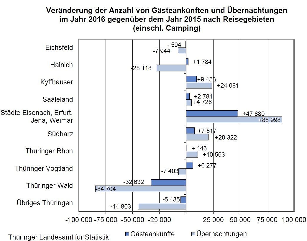 Deutliche Unterschiede in den Thüringer Reisegebieten prägen die Entwicklung im Jahr 2016. Sieben der zehn Reisegebiete erzielten im Jahr 2016 ein Gästeplus, die Hälfte der Reisegebiete konnte auch bei den Gästeübernachtungen ein Plus verbuchen. Das Reisegebiet der Städte (Eisenach, Erfurt, Jena und Weimar) konnte im Jahr 2016 deutlich zulegen (Gäste: + 47 880 bzw. 3,9 Prozent; Übernachtungen: + 88 998 bzw. 4,1 Prozent) und auch viele der kleineren Reisegebiete konnten mit ihren touristischen Angeboten ein Gäste- und Übernachtungsplus erreichen.