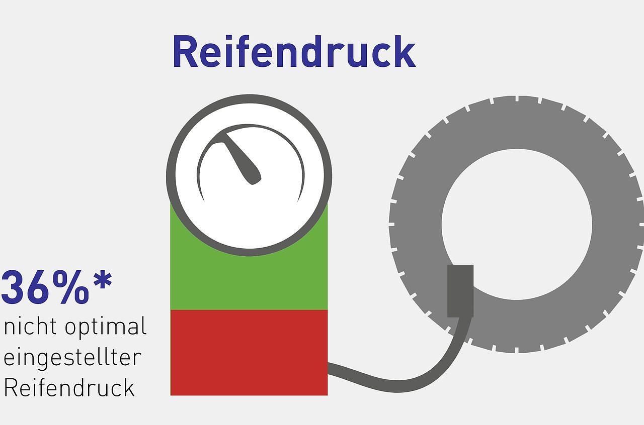 Die Bedeutung des Reifendrucks wird regelmäßig unterschätzt. Mehr als ein Drittel der während der Wash & Check-Aktion 2016 geprüften Reifen, nämlich 36 Prozent, wiesen einen zu hohen oder zu niedrigen Reifendruck auf. Das kann nicht nur Beschädigungen nach sich ziehen: Der Spritverbrauch erhöht sich, der Bremsweg wird länger und bei Ausweichmanövern bricht der Wagen leichter aus.
