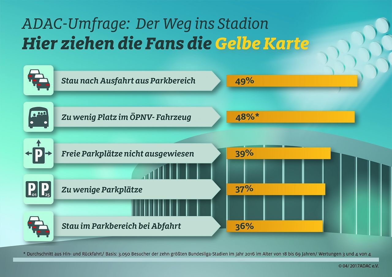 Einen Fußballfan kann abseits des Spiels nichts erschüttern. Zwar müssen die Besucher auf ihrem Weg zum und vom Stadion in den meisten Fällen mit Hindernissen rechnen, dennoch beurteilen sie die Gegebenheiten rund um die großen deutschen Fußballarenen mehrheitlich positiv. Das ergab eine Umfrage des ADAC unter Besuchern der zehn größten deutschen Erstliga-Fußballstadien...