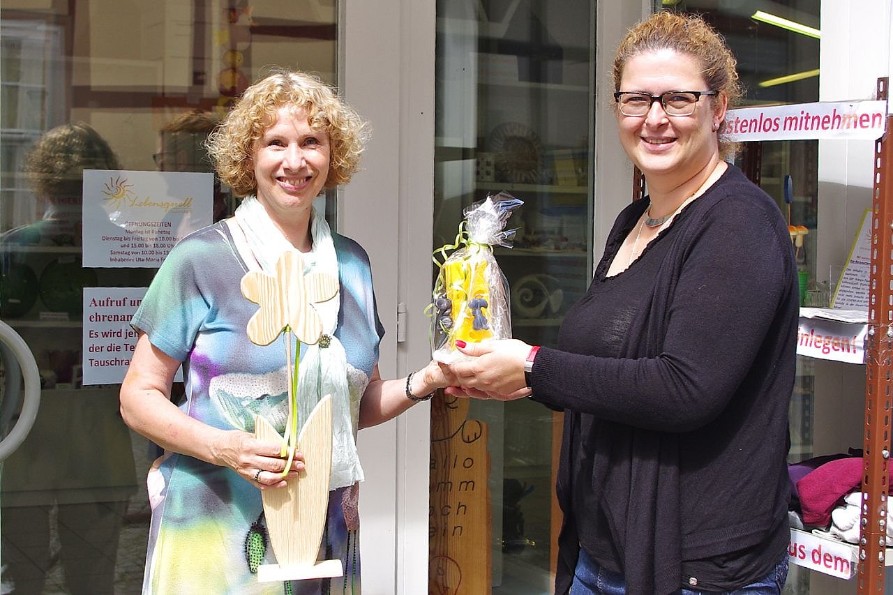 Autor: enVor dem Lebensquell-Laden: Uta-Maria Freckmann (li) mit Werkstattladen-Leiterin Jana Föllmer. Foto:Helen Schwenderling