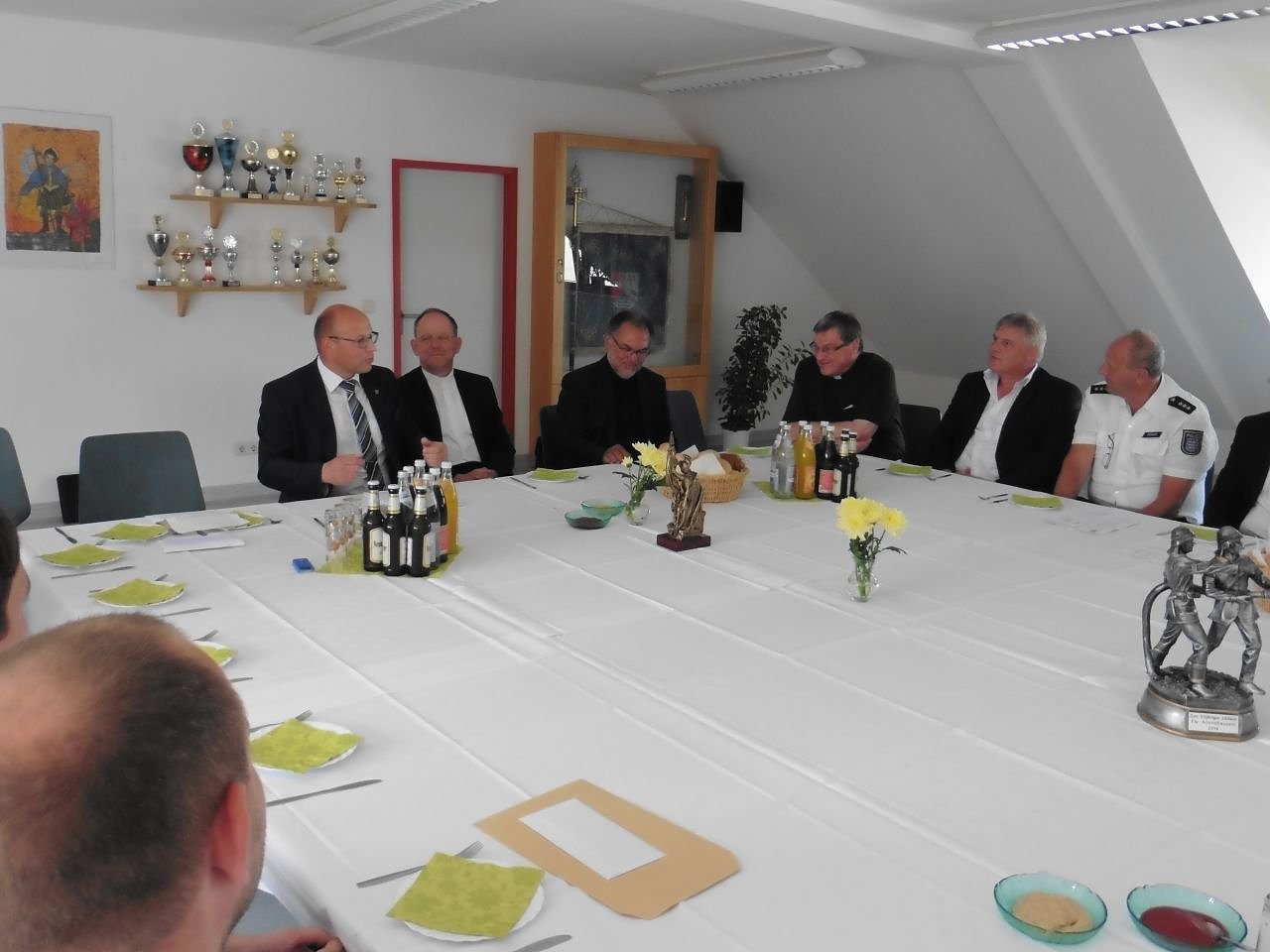 Autor: enHier fand eine Gesprächsrunde mit Feuerwehrleuten, Rettungskräften, Polizeibeamten, Seelsorgern und Vertretern der Stadt Leinefelde-Worbis statt. Bei der Begrüßung in der Leinefelder Feuerwehr gratulierte Bürgermeister Marko Grosa dem Bischof nachträglich zu seinem 60. Geburtstag.