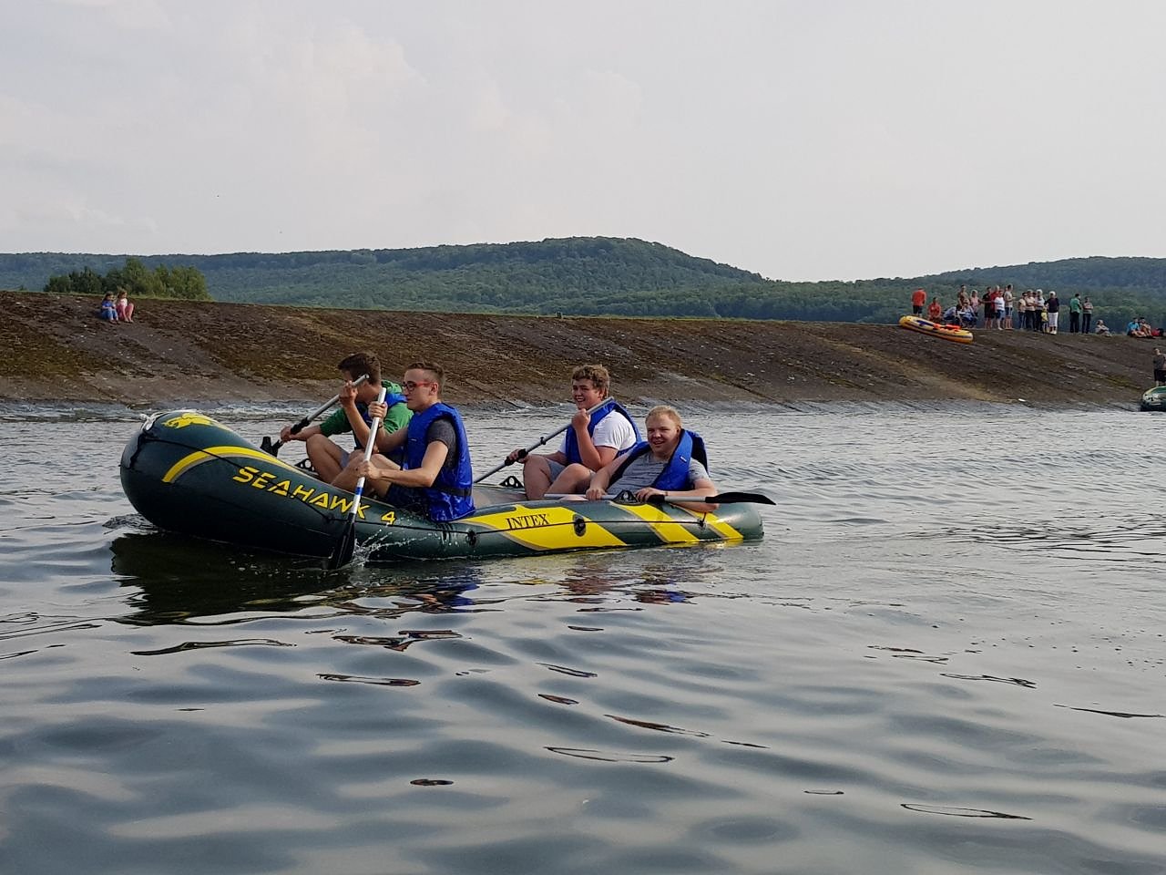 Im ersten Wettbewerb galt es, mittels einer Wasserspritze, deren Pumpe zuvor mit in kleinen Bechern und in Schubkarren transportiertem Wasser gefüllt werden musste, drei Hütchen von Stangen zu schießen. Anschließend ging es auf den See. In mit jeweils vier Padlern besetzten Schlauchbooten war 100 Meter auf den See hinaus zu fahren, an einer Boje zu wenden und dann schnellstmöglich wieder die Staumauer zu erreichen.