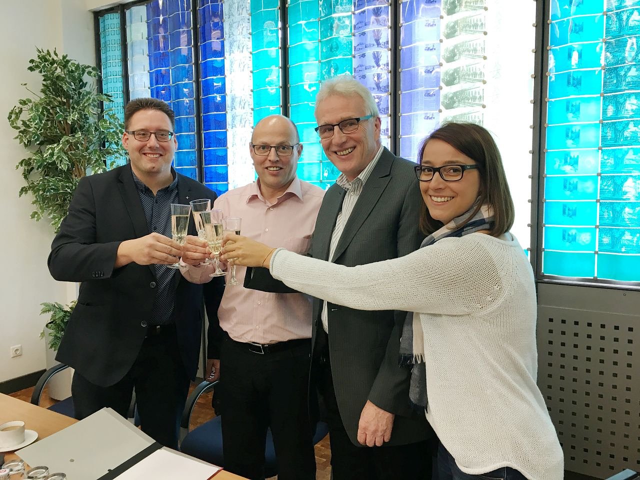 Bürgermeister Marko Grosa (2.v.li) und Diakonie-Geschäftsführer Reiner Engel nach vertragsunterzeichnung. Anika Huke, Mitarbeiterin des Jugendamtes des Landkreises Eichsfeld, brachte die von Landrat Werner Henning unterzeichneten Verträge mit. Links im Bild: Reiner Engels Stellvertreter Ralf Lippold.
