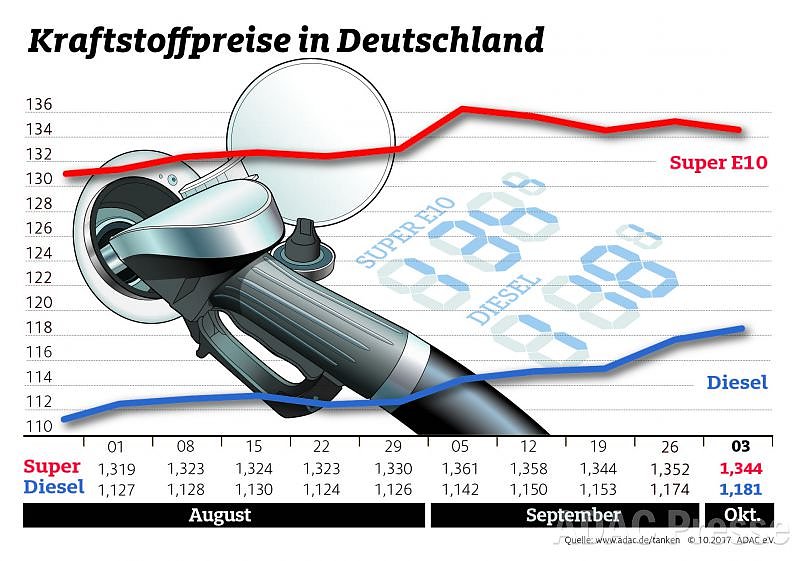 Gegenläufige Entwicklung auf dem Kraftstoffmarkt: Während der Benzinpreis gegenüber der Vorwoche nachgegeben hat, ist Dieselkraftstoff erneut teurer geworden. Laut ADAC kostet ein Liter Super E10 im bundesweiten Mittel 1,344 Euro, das ist ein Minus von 0,8 Cent. Der Dieselpreis ist hingegen um 0,7 Cent auf 1,181 Euro je Liter gestiegen...