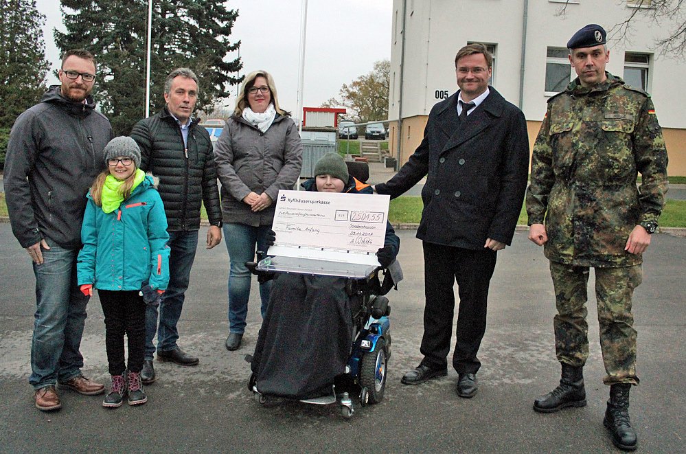 Oberstleutnant Ulrich Rölle begrüßte heute bei der Übergabe des Spendenschecks Marco Wuttke vom finanziellen Unterstützer der Veranstaltung, der Autohaus Peter-Gruppe, sowie Stefan Schard der im Auftrag von Bürgermeister Joachim Kreyer teilnahm. Vor den angetretenen Einheiten in der Karl-Günther-Kaserne war auch die Familie von Luca dabei.