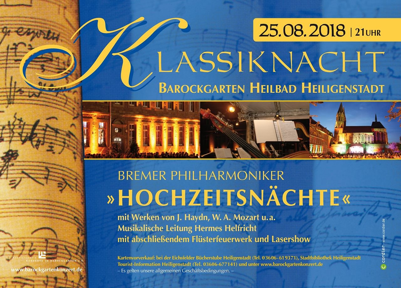 Autor: enDie Bremer Philharmoniker werden mit dem Konzert "Hochzeitsnächte" Werken von J. Haydn, W. A. Mozart u.a. zu Gehör bringen. Die Musikalische Leitung hat Hermes Helfricht. Das Barockkonzert ist am 25. August 2018 ab 21 Uhr mit abschließendem Flüsterfeuerwerk und Lasershow.