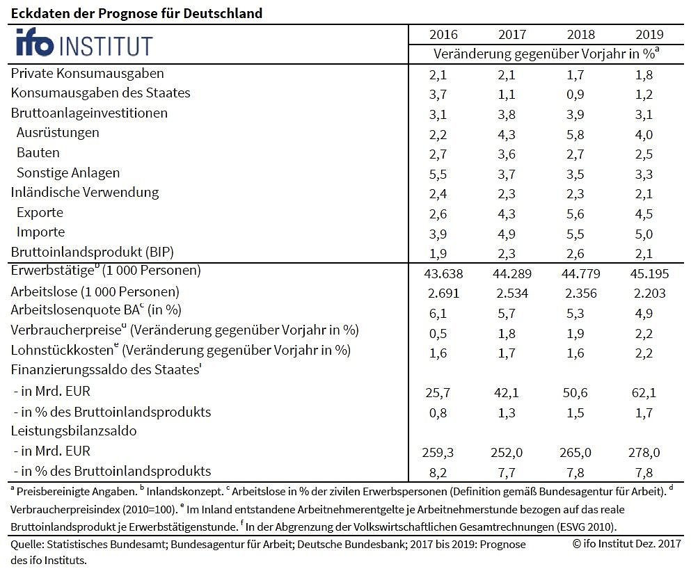 Der Schwung vom Jahre 2017 verlängert sich bis weit ins Jahr 2018 hinein. Vor Kurzem hatte das ifo bereits seine Prognose aus dem Juni für dieses Jahr von 1,8 auf 2,3 Prozent hochgesetzt.