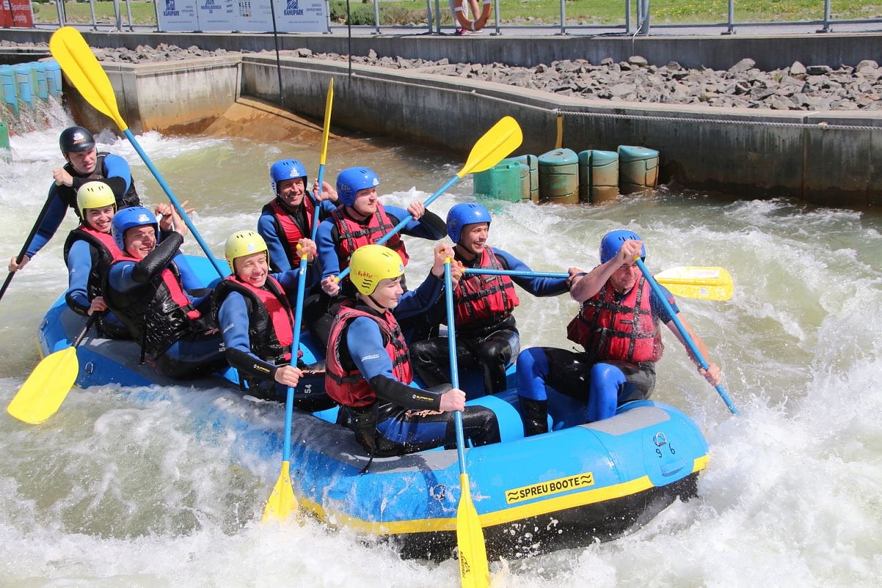 Erstes Ziel war der Wildwasserpark am Markkleeberger See. Nach einer kurzen Einweisung kletterten die 17 Teilnehmer der Tour in zwei große Schlauchboote und machten sich für die rasante Fahrt den Kanal hinunter bereit. Ob vorwärts, rückwärts oder seitlich immer schneller ging es durch die turbulente Strecke. Trocken blieb bei der Aktion keiner, aber auch der Spaß blieb nicht zu kurz.
