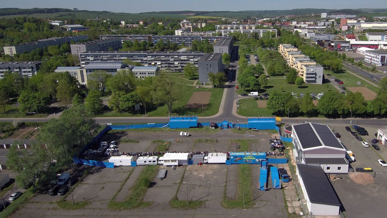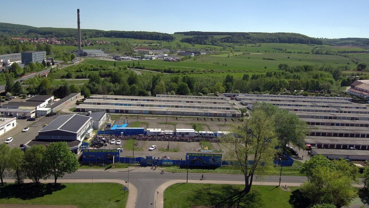 Während in der Innenstadt neue Autos vorgestellt wurden, wurde in der Nähe des Solargebäudes demonstriert, was man mit Autos noch machen kann. Für diejenigen, die bei der Autostuntshow waren, hier ebenfalls der Blick von oben: