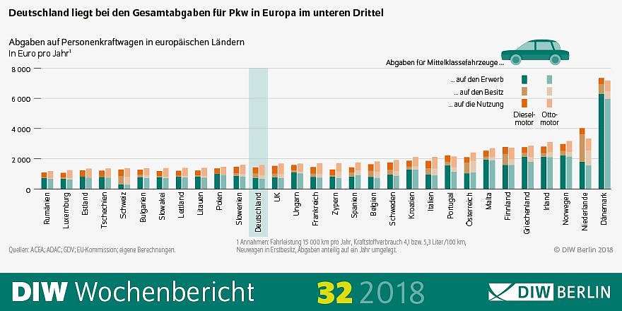 Die Summe der Abgaben, die beim Erwerb (Umsatzsteuer, Zulassungssteuer und -gebühren), bei der Haltung (Kfz-Steuer, Versicherungssteuer) sowie bei der Nutzung (Steuern auf Kraftstoffe) für einen Mittelklassewagen im Erstgebrauch mit einer jährlichen Fahrleistung von 15.000 Kilometern anfallen, liegen für die Mehrzahl der Länder zwischen 1.200 und 2.000 Euro. Für die Länder mit noch höheren Abgaben ist die Zulassungssteuer – die in Deutschland nicht existiert – ausschlaggebend. Zudem ergibt diese Beispielrechnung unter dem Strich in 26 Ländern eine geringere Abgabenbelastung für Pkw mit Dieselmotor als für die mit Ottomotor.