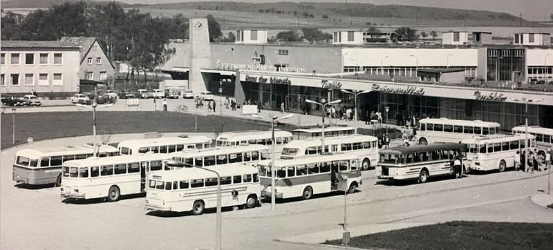 Autor: ikDieses Bild kennen die älteren Bürger von Leinefelde und auch aus dem gesamten Landkreis: die Busse fuhren direkt vor der Baumwollspinnerei ab. Hier sieht man rechts neben dem Werkeingang das Centra, wo man schnell vor Schichtbeginn oder nach Schichtende noch einkaufen konnte.