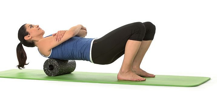 Für die obere Rückenmuskulatur und die Brustwirbelsäule legen Sie die Faszienrolle mittig unter Ihren Rücken. Die Arme verschränken Sie über dem Oberkörper und heben das Gesäß. Rollen Sie langsam von der Mitte hoch bis zu den Schulterblättern. Auch diese Übung kann an der Wand ausgeführt werden, wenn die Massage zu intensiv ist.