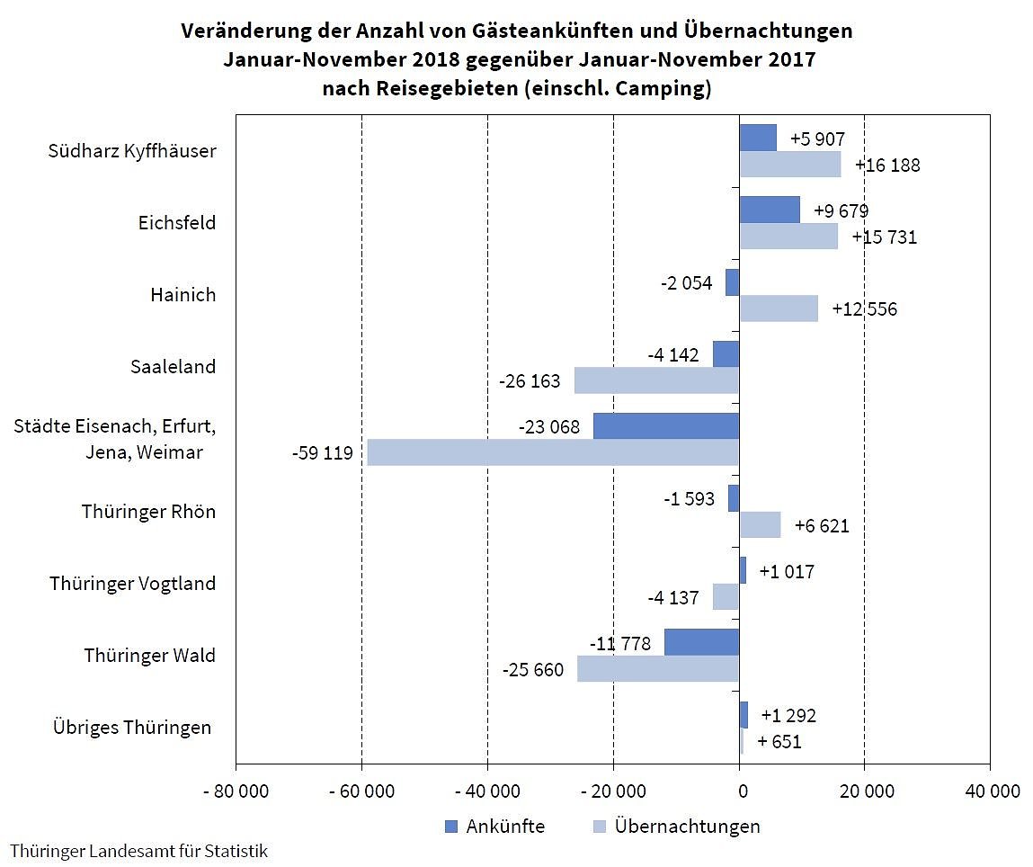 Von drei Tourismusregionen wurde von Januar bis November 2018 gegenüber dem Vorjahreszeitraum ein höheres Gäste- und Übernachtungsaufkommen gemeldet. Die höchsten Zuwachsraten erzielte die Region Eichsfeld, mit einem Gästeplus von 9,2 Prozent und einem Plus an Übernachtungen von 5,1 Prozent. Höhere Werte als im Vorjahreszeitraum verzeichneten ebenfalls die Regionen Südharz Kyffhäuser und Übriges Thüringen.