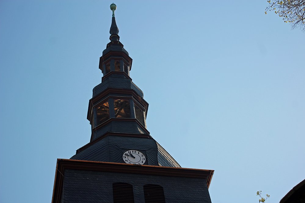 Nach der Sicherung des Schiefen mit einem Stahlgerüst und der Sanierung der Turmhaube waren es Schlag 11:00 Uhr soweit, die Glocken läuteten wieder:
