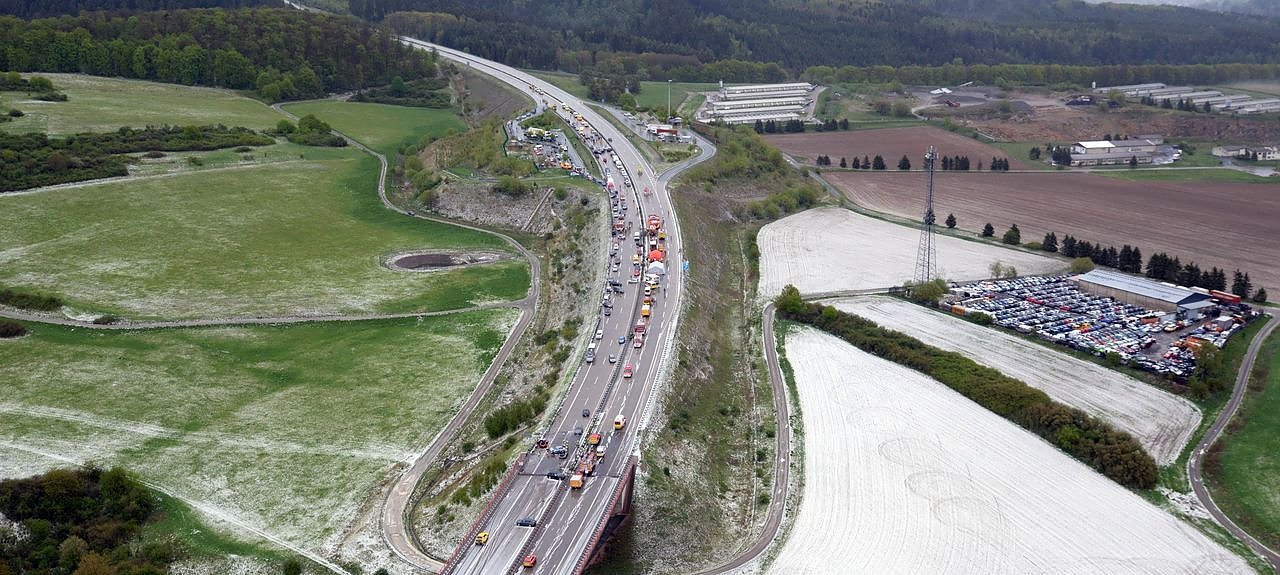 Innerhalb kürzester Zeit ereigneten sich hier auf der Richtungsfahrbahn Sangerhausen vier Verkehrsunfälle, bei denen es fast nur bei Blechschäden blieb. Auf der Gegenfahrbahn in Richtung Schweinfurt kam es zu mehreren Verkehrsunfällen, an denen insgesamt (Stand: 14:45 Uhr) 50 Fahrzeuge beteiligt sind.