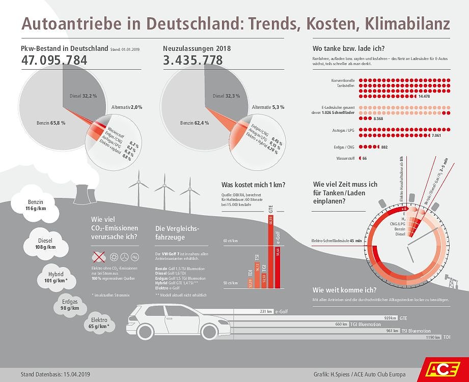 Ist ein Neuwagenkauf geplant, sollten jetzt auch die Alternativen in die Betrachtung einbezogen, die Vor- und Nachteile der zur Verfügung stehenden Antriebsarten mit den eigenen Ansprüchen abgeglichen, die Verbrauchswerte genau geprüft und vor allem die jeweiligen Fahrzeuge gründlich getestet werden. Der ACE, Deutschlands zweitgrößter Autoclub, gibt einen Überblick.