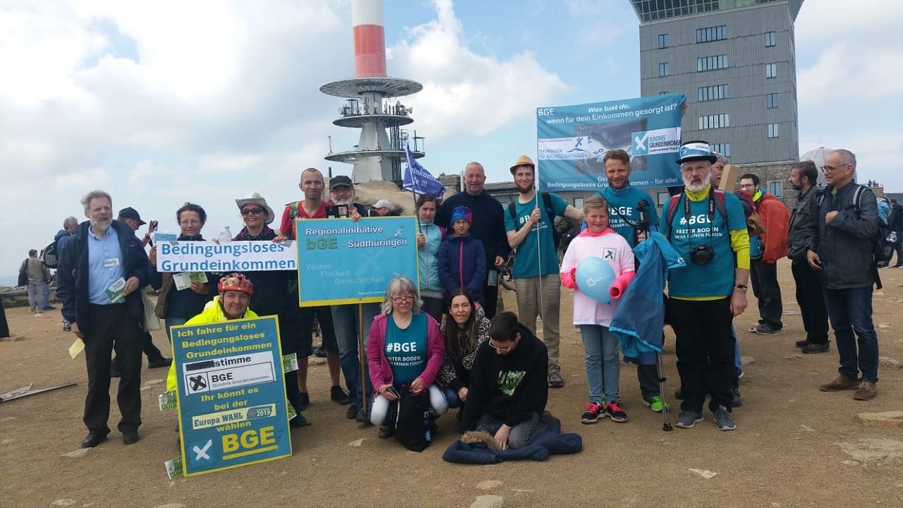 Geschafft! Die Brockenwanderung gemeinsam von Thüringern, Sachsen-Anhaltern und Niedersachsen, die sich für ein bedingungsloses Grundeinkommen einsetzen, hat schon mal geklappt...