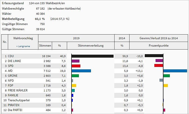 So, 20:13 Uhr 26.05.2019 Europawahl 2019 Aktuelle Ergebnisse Wir berichten an dieser Stelle über den Stand der Auszählung der Stimmen zur Europawahl für den Landkreis Eichsfeld.... Europawahl Zwischenergebnis (Foto: Statistik) Autor: ik
