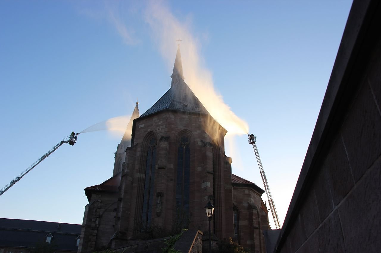 Für die Übung wurde angenommen, dass im Dach über dem Altarraum Feuer ausgebrochen sei. Aufgabe der Einsatzkräfte war es, die Brandausbreitung auf das Langhaus zu verhindern. Um umfassend gegen die Flammen vorgehen zu können, kamen gleich