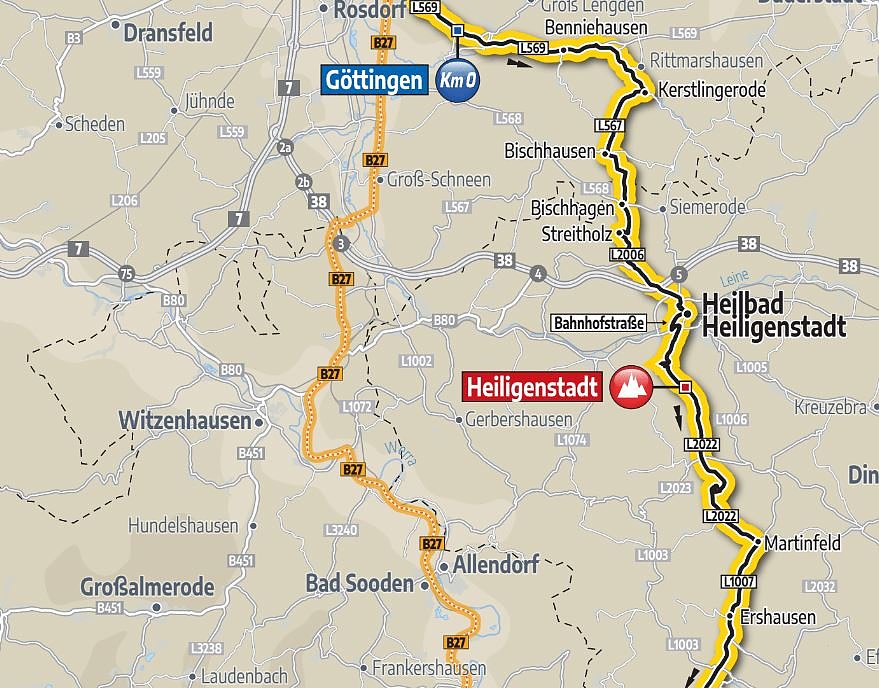 Bereits kurz nach dem Start queren die Radsportler die Landesgrenze zwischen Niedersachsen und Thüringen. Im Jahr des 30-jährigen Jubiläums des Mauerfalls wird die Strecke zur Hommage an die Öffnung der innerdeutschen Grenze. Zwischen Bischhausen und Bischhagen wird der Landkreis Eichsfeld erreicht. Das Heilbad Heiligenstadt sorgt mit einem steilen Anstieg für eine frühe Herausforderung, denn bereits nach 30 Kilometer sind bei den Profis die Kletterbeine gefragt.
