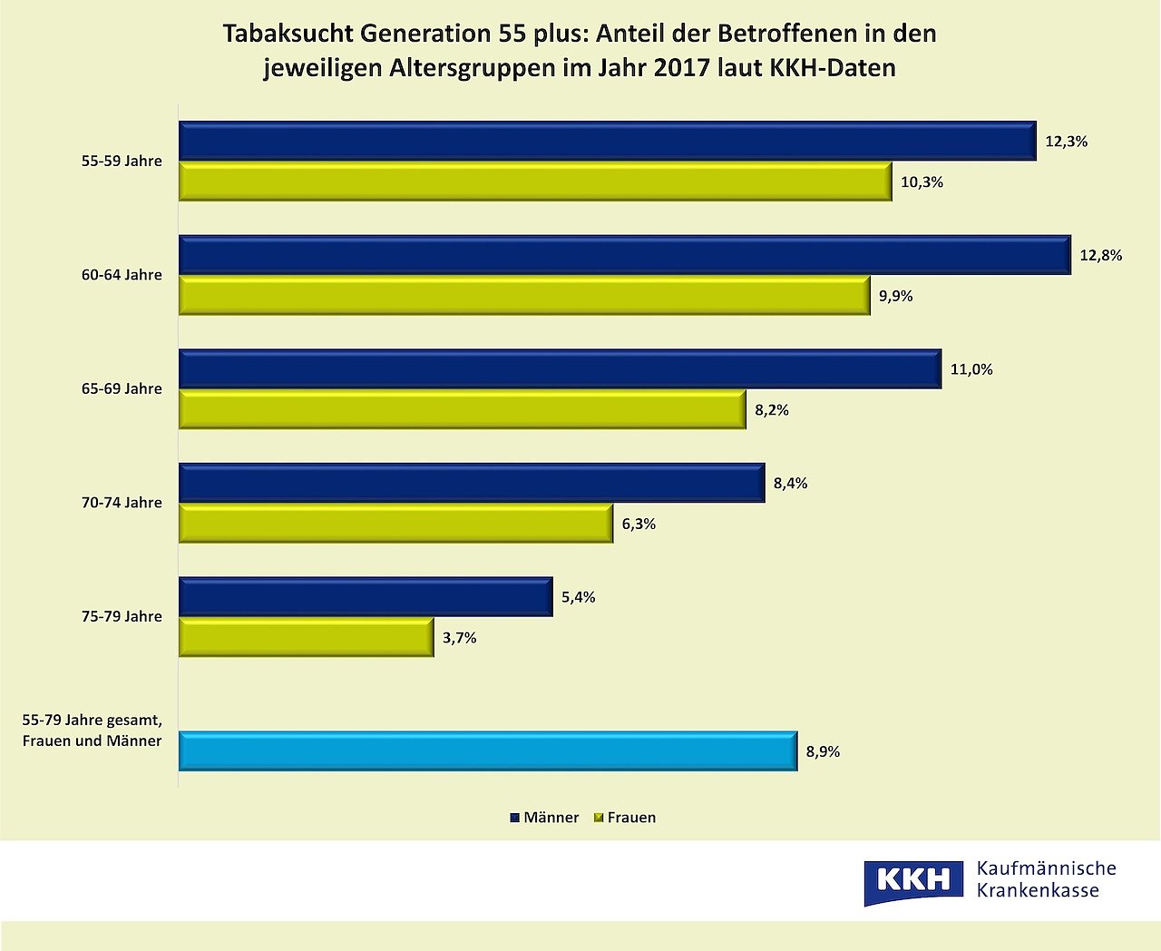 Zwar sinkt auch bei den Älteren die Zahl der Alltagsraucher im Allgemeinen, die Zahl der Exzessiv-Raucher aber hat laut Daten der KKH Kaufmännische Krankenkasse drastisch zugenommen. So wurden im Jahr 2017 rund 50.000 Versicherte im Alter von 55 bis 79 Jahren wegen Tabakabhängigkeit, Entzugserscheinungen, eines akuten Tabakrausches oder psychischer Probleme aufgrund von Tabak ärztlich behandelt.