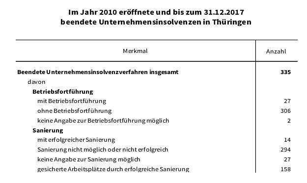 In Thüringen wurden von den 3 862 im Jahr 2010 eröffneten Insolvenzverfahren bis Ende 2017 insgesamt 95,9 Prozent (3 704 Verfahren) beendet. Nach Mitteilung des Statistischen Landesamtes mussten die Gläubiger dabei auf 97,9 Prozent ihrer Forderungen verzichten.
